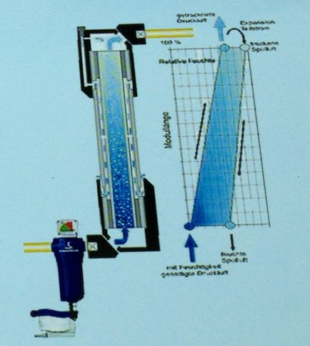 膜式干燥機(jī)由空心纖維超濾裝置、膜組、膜管等主要部件組成,其內(nèi)壁為膜層,膜層結(jié)合在海錦式的外壁上,外壁有粗孔,內(nèi)層起超濾作用,內(nèi)膜膜孔的大小決定管內(nèi)阻留物質(zhì)的分子量,在壓縮濕空氣經(jīng)過(guò)濾器后,進(jìn)入膜式干燥機(jī)首先通過(guò)一束由高選擇性纖維膜制成的纖維管,水蒸氣能夠透過(guò)纖維膜擴(kuò)散到膜層外部,在出口處一小部分的壓縮空經(jīng)一針閥釋放,膨脹減壓后的反歡氣的相對(duì)溫度急劇下降,反弞氣流經(jīng)的外表層與進(jìn)氣作逆向運(yùn)動(dòng)。由于壓縮空氣和反歡氣相對(duì)溫度的差異導(dǎo)致濕氣向纖維管外擴(kuò)散擴(kuò)散出來(lái)的水蒸氣隨反吹氣排出,得到干燥的壓縮空氣。