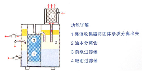 在壓力的作用下乳液狀含油冷凝液經(jīng)過(guò)連接管道進(jìn)入前置分離體進(jìn)行離心分離,蒸氣經(jīng)除油(吸附)潔凈后排入環(huán)境空氣。水,油液體在重力的作用下落入槽內(nèi),其中的少量固體殘?jiān)羧肟汕逑吹谋蹆?nèi)。在重力的作用下油水逐步進(jìn)行分離。浮在頂層的油經(jīng)排放閥可直接回收、而分離后的廢水含油量少于10ppm,達(dá)到環(huán)保的要求,可直接排入污水管道。