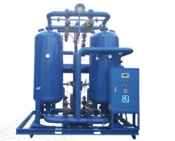 壓縮熱再生干燥機(jī)屬有熱再生干燥機(jī),其再生加熱所需熱量全部利用了壓縮空氣的高溫?zé)崃浚沟谜麄€(gè)裝置無須配置外部熱源,由于高溫壓縮空氣直接進(jìn)入吸附器再生吸附床層,其高層熱量被吸附劑所吸收減少了后部冷卻器的熱負(fù)荷,人而相應(yīng)減少冷卻水耗量,因而壓縮熱非常具有節(jié)能特性。 在加熱階段采用高溫壓縮空氣對吸附劑加熱后,經(jīng)后部冷卻器冷卻降溫、除水,重新在另一個(gè)吸附器進(jìn)行干燥凈化去后續(xù)工藝作為成品氣,所以整個(gè)加熱再生無須消耗產(chǎn)品氣,這樣很好地滿足后續(xù)工藝產(chǎn)品氣,與鼓風(fēng)再生干燥機(jī)相比,其流程設(shè)備配置簡單,因此整機(jī)技術(shù)特性比較優(yōu)異。