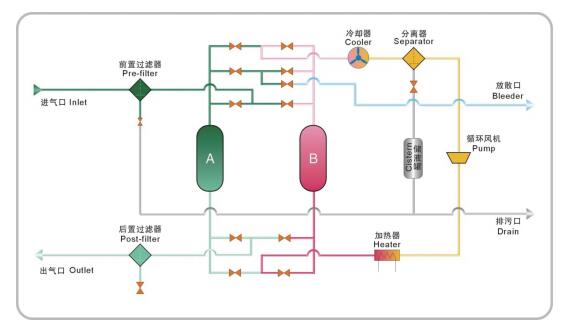 KCN干燥機(jī)應(yīng)用變溫吸附原理,在常溫高水汽分壓下吸附,在較高溫、低水汽分壓下解析再生。當(dāng)天然氣進(jìn)入干燥機(jī)后,首先在前置過(guò)濾器中進(jìn)行過(guò)濾,在進(jìn)吸附塔A,氣體中的水分被分子篩吸附,成為干燥的成品氣,由后置過(guò)濾器過(guò)濾后輸出;在吸附塔A干燥的同時(shí),在閥體的作用下,加熱器、吸附塔B、再生氣冷卻器、分離器和再生壓縮機(jī)形成閉式再生回路。回路中氣體由壓縮機(jī)加壓后至加熱器加熱,再到吸附塔B對(duì)飽和分子篩進(jìn)行升溫解析,升溫解析結(jié)束后,高溫氣體再經(jīng)壓縮機(jī)升壓后,經(jīng)過(guò)冷卻器冷卻后的氣體在對(duì)吸附塔B里升溫解析后的分子篩進(jìn)行吹冷并帶走分子篩里的水分,經(jīng)過(guò)分離器后水分進(jìn)入儲(chǔ)液罐,如此循環(huán)一定時(shí)間,對(duì)分子篩進(jìn)行再生;再生后雙塔交替切換。